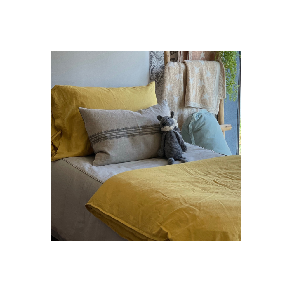 Estructura de madera cubierta de espuma de alta densidad, y sobre eso funda de lino amarras fácilmente extraible para ser lavada. El respaldo simplemente se apoya al suelo y se deja fijo gracias a la presión del boxspring.